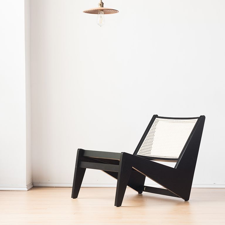 A low-sitting North American ash wood chair with bold, contemporary angles, softened by the addition of natural rattan for a modern luxe look.