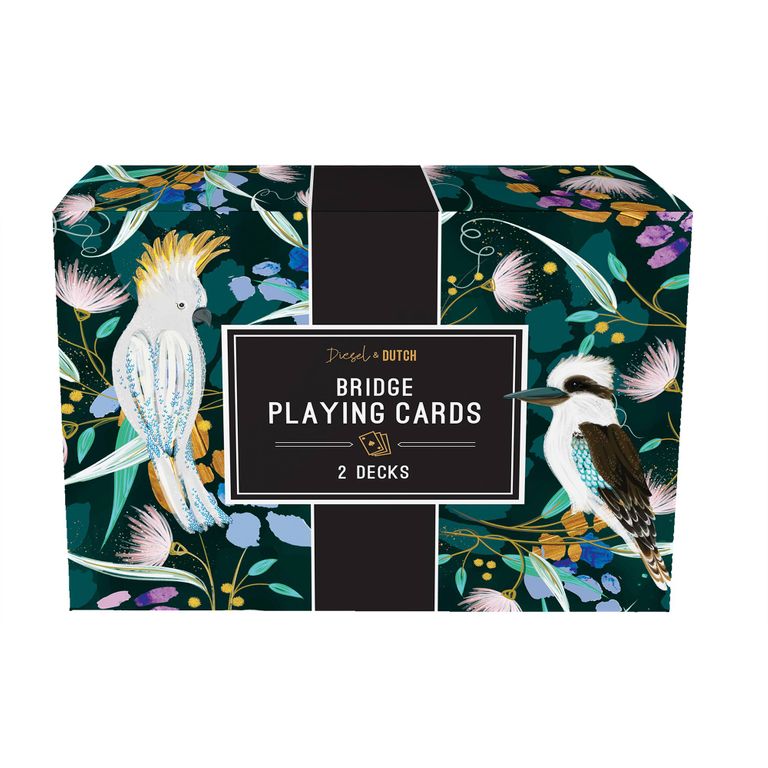 Two 54 piece quality bridge playing card decks, with each featuring Australia's most iconic birds of the bush - the Cockatoo and Kookaburra. Hours of fun and entertainment playing on official 3.5 x 2.25 inch bridge-sized playing cards. After play, the cards can be packed away in the storage tray and box for next time.