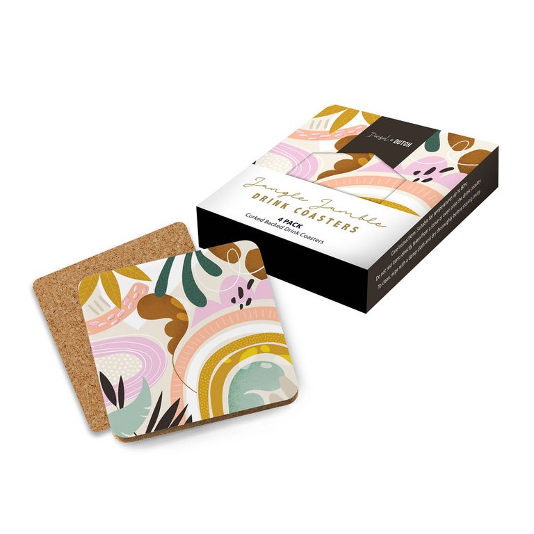 Jungle Jumble, by Milly and Mae Designs, is a fun abstract collection of leaves and energetic shapes. This set of 4 corked backed drink coasters are designed off a cream base, is home to an array of organic tones and textures found in nature, supported by hand drawn patterns and line work. Suitable to hold items up to temperatures of 80c