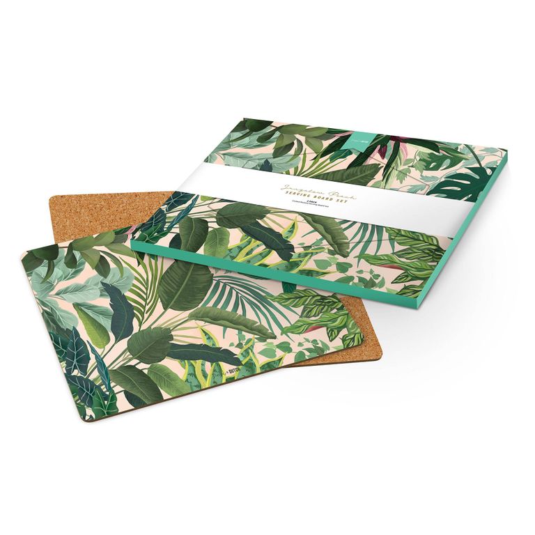 Jungalow Peach by Milly and Mae Designs, illustrates the beautiful tropical leaves found in rainforests across north-eastern Australia. Showcasing a diversity of plant life, the peach base colour provides a stunning contrast against the many shades of green and broad leaf plant shapes. Printed onto a set of 2 cork backed serving boards, they will look great when entertaining whilst being practical when serving food to your dining table. Suitable to hold items up to temperatures of 80c.