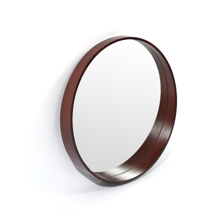 Tradition meets contemporary with this round wall mirror. Made of wood that’s finished in a warm walnut, it features a curved shelf at its base for convenience or styling.