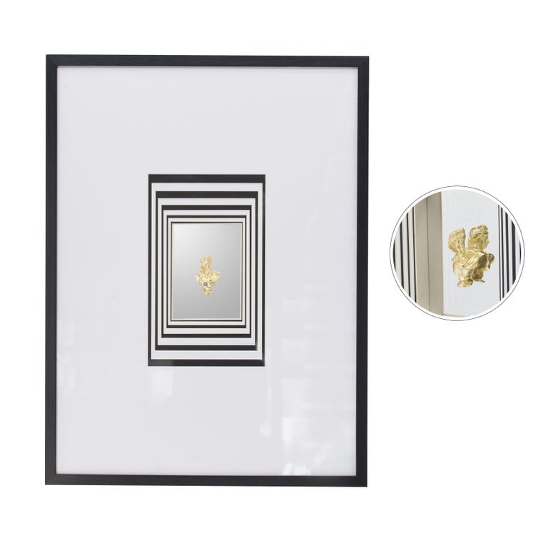 Classic, modern and luxurious. This mirrored wall art is striking with its black geometric stripes and golden Roman bust.