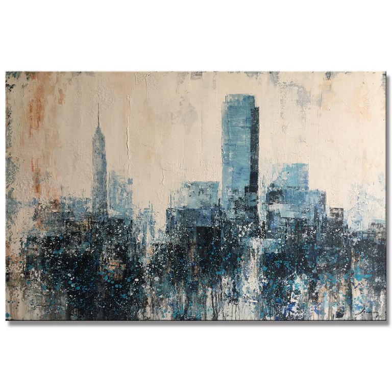 An abstract impression of the road to Manhattan along the Long Island Expressway. After a long stretch of highway, the cityscape suddenly pops into perfect view after coming up over the hill in Queens. Rustic, dusky and charming, this oil on canvas compliments a contemporary setting, with similar coloured furnishings.